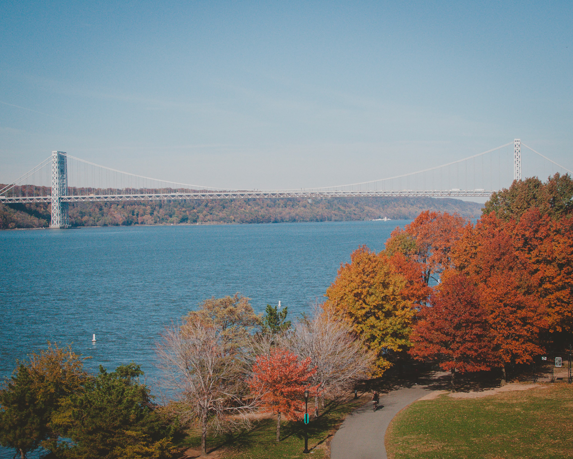 A great view of the George Washington Bridge from Fort Washington Park and the Hudson River Greenway in Manhattan.