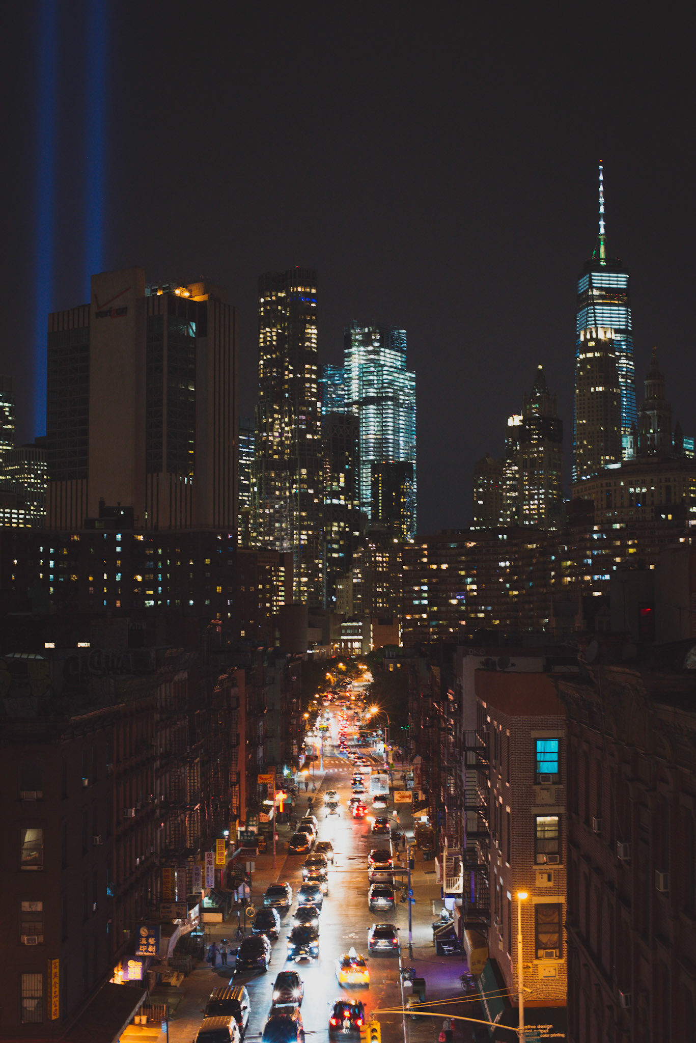 Lower Manhattan skyline and Tribute in Lights from the Manhattan Bridge